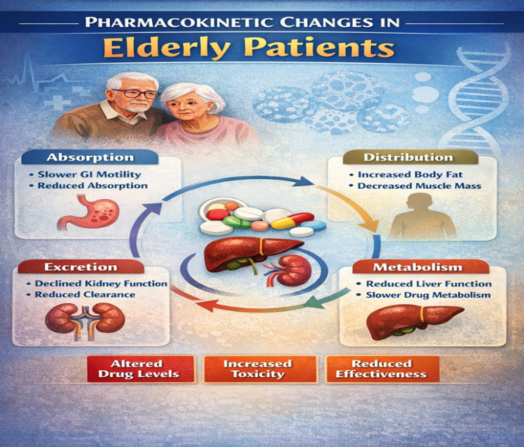 Pharmacokinetics describes how the body absorbs, distributes, metabolises, and eliminates drugs. In elderly patients, normal ageing leads to gradual changes in these processes, which can significantly affect the behaviour of chemotherapeutic agents. These changes may result in altered drug levels, increased toxicity, or reduced treatment effectiveness, making chemotherapy management more complex in older adults [2, 9].