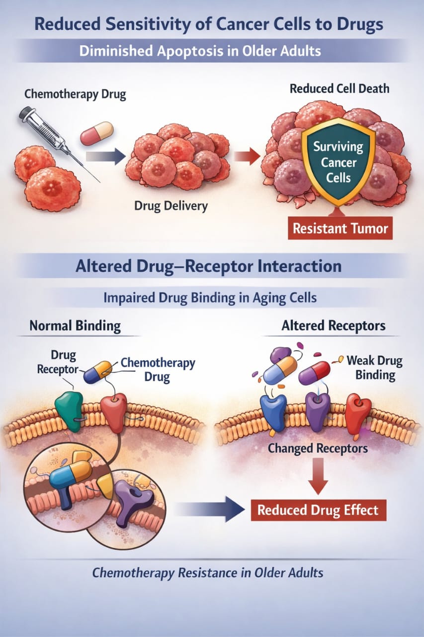 In older adults, cancer cells may become less responsive to chemotherapy due to changes in cellular mechanisms that control growth and death. For example, the ability of drugs to trigger cell death (apoptosis) may be diminished. As a result, even when the drug reaches the tumour in adequate amounts, its effect on killing cancer cells is reduced, contributing to chemotherapy resistance [3].