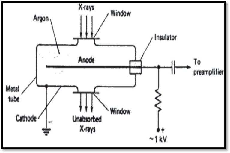 A metal tube filled with an inert gas, such as argon, krypton, or xenon, makes up a gas-filled detector, a form of X-ray detection apparatus. X-rays can flow through the tube's two transparent windows, which are positioned on opposing sides and are composed of materials like mica, beryllium, aluminum, or mylar. The tube's lower side, which is negatively charged, serves as the cathode, while the tube's center has an anode in the shape of a thin wire. Excitation and the loss of an outer electron result from interactions between the X-rays and the inert gas's atoms when they enter through one of the windows. An electric signal is produced by the free electrons produced by this ionization process moving in the direction of the anode. The voltage applied to the anode determines how many electrons arrive at the anode for every incoming X-ray photon. Minimal ionization takes place if the potential is less than 200 volts. The detector functions in the ionization chamber zone, where primary ionization is monitored, when the potential is between 200 and 400 volts. Secondary ionization intensifies the signal in the proportionate counter zone, which has a potential between 800 and 1000 volts and is proportional to the X-ray photon's energy. The detector operates in the Geiger counter zone at even higher potentials, between 1100 and 1600 volts, where a massive electron avalanche is created, producing a consistent pulse for every photon detected, independent of energy. Gas-filled detectors, which provide many modes of operation depending on the applied voltage and the particular requirements of the measurement, are essential in X-ray spectroscopy and radiation detection.(figure no – 5)