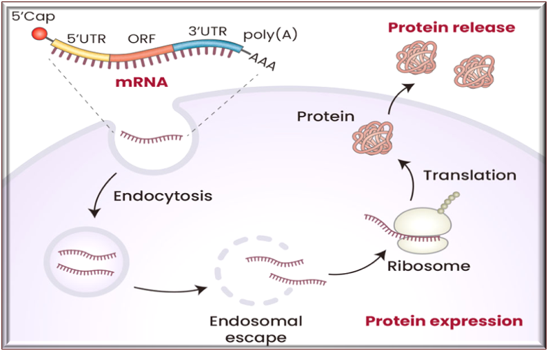 mRNA therapeutics work by delivering synthetic mRNA into cells, typically using nanocarriers. Once inside the cytoplasm, the cellular machinery translates the mRNA into a functional protein. These proteins can serve various roles- acting as antigens to stimulate immune responses (in the case of vaccines), replacing deficient or dysfunctional proteins, or modulating cellular pathways. The design of the mRNA molecule is critical: codon optimization enhances translation efficiency, while incorporation of modified nucleotides (such as pseudouridine) reduces recognition by innate immune sensors, improving stability and reducing inflammatory responses.