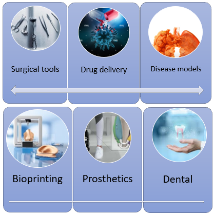 3D printing offers vast applications in medicine and pharmacy, enabling the fabrication of tablets, capsules, implants and Oro dispersible films with personalized dosing. Its flexibility allows dose and dosage adjustments tailored to patient needs, particularly benefiting paediatrics, geriatric, and orphan drug formulations. The technology enhances pharmaceutical compounding, enabling on-demand production in hospitals and pharmacies, with additional advantages like taste masking and improved patient acceptability. Studies highlight that tablet shape like the shape of the tablet, whether spherical, toroidal, disc-like, capsule-shaped, or a tilted diamond, greatly affects how easy it is swallow and handle, with torus-shaped tablets being the most preferred. 3D printing allows the creation of tablets that contain multiple drugs with controlled dissolution profiles, reducing medication burden and allowing precise formulation adjustment. Beyond oral dosage forms, it has been applied for transdermal drug delivery via microneedles and for personalized vaginal rings, highlighting its potential for tailored drug delivery systems despite current industrial challenges.