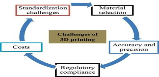 Another major application of 3D printing is in the development of implantable drug-delivery devices. Customized implants can be produced to fit a patient’s anatomy exactly and release drugs at a controlled rate for weeks or months. This is particularly useful in chemotherapy, orthopedic treatments, and hormone therapy. Additionally, 3D-printed microneedle arrays are being explored for painless transdermal drug delivery and vaccine administration. In tissue engineering, 3D printing allows the creation of porous scaffolds that mimic natural tissues and support cell growth. These scaffolds can be loaded with growth factors, antibiotics, or regenerative agents to promote healing in bone, skin, or cartilage injuries. The potential to eventually print functional organs makes 3D printing one of the most revolutionary technologies in biomedical science. Despite its advantages, 3D printing in pharmaceuticals also faces several challenges. One of the major limitations is the restricted availability of pharmaceutical-grade printable materials. Polymers such as polyvinyl alcohol (PVA), polyethylene glycol (PEG), polylactic acid (PLA), and hydroxypropyl methylcellulose (HPMC) are commonly used, but each has limitations regarding mechanical strength, drug compatibility, and thermal stability. Heat-sensitive drugs cannot withstand the high temperatures used in FDM printing, while photopolymer-based techniques may raise concerns about the toxicity of unreacted monomers. Another challenge is the slow production speed of 3D printing, which makes it less suitable for large-scale industrial manufacturing. Regulatory guidelines are also still evolving, and ensuring batch-to-batch uniformity, stability, and quality control for individually printed dosage forms remains complex. Additionally, the cost of advanced printers, software, and trained personnel represents a barrier for many pharmaceutical settings. Nevertheless, the future potential of 3D printing in pharmaceutical science is extremely promising. Research is ongoing to develop new printable excipients, enhance drug-loading capacity, and improve printability of biological molecules such as peptides, vaccines, and monoclonal antibodies. As digital healthcare advances, the idea of hospital-based or pharmacy-based on- demand printing of medicines may soon become a reality. This would enable doctors to prescribe customized doses that pharmacists print instantly according to the patient’s exact requirement.[5]