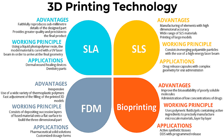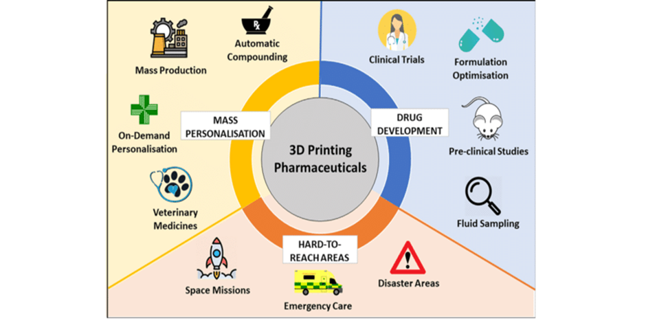 Personalized medicine and medication research are being revolutionized by 3D printing in pharmaceutical technology. 3D printing makes it possible to precisely fabricate intricate medication delivery systems, resulting in personalized dose forms that are suited to the requirements of each patient. This technique makes it easier to quickly prototype novel medications, create controlled release formulations, and create multi-layered tablets. It lowers expenses, improves manufacturing efficiency, and has the potential to improve treatment results through patient-specific medicines.