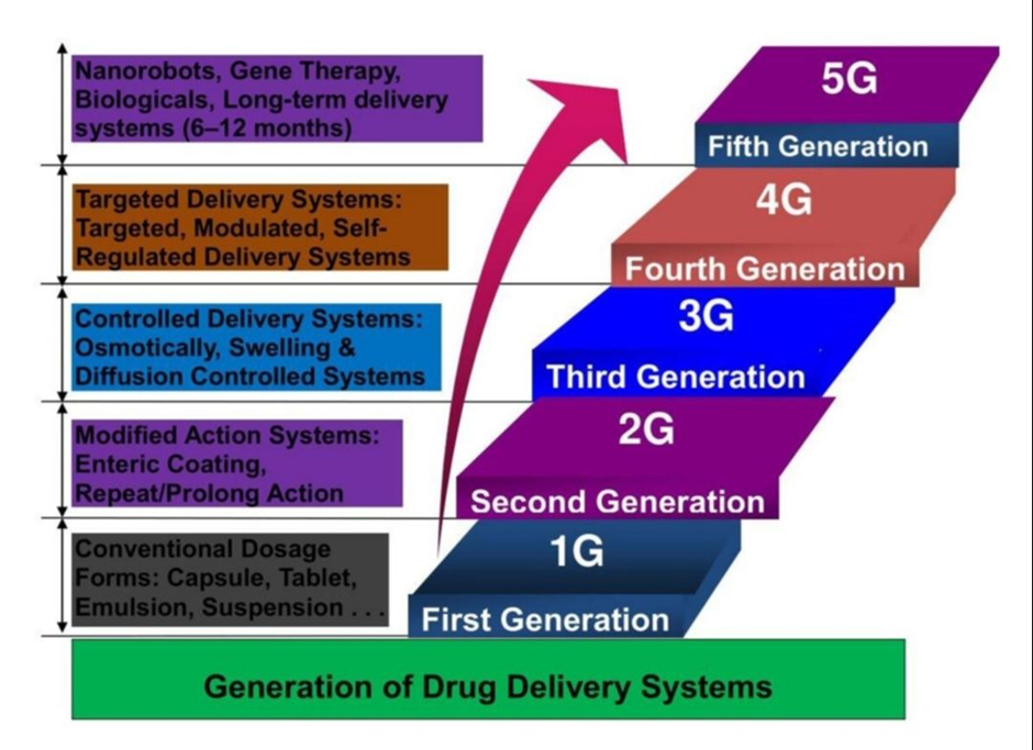 Drug delivery (DD) encompasses the various methods, formulations, technologies, and processes used to transport pharmaceutical substances within the body to achieve intended therapeutic outcomes [9-10]. This field includes strategies for administering medications to both humans and animals to ensure optimal therapeutic effects. Recent advancements in drug delivery systems (DDSs) have increasingly emphasized the development of smart DD, which aims for precise administration of drugs concerning timing, dosage, and site of delivery while prioritizing safety and efficacy [11]. The rise of novel drug delivery systems (NDDSs) has garnered significant interest, as these systems improve the therapeutic potential of both new and established medications through targeted, controlled, and sustained release mechanisms that align with actual drug demands [10]. The realm of DD is evolving rapidly within pharmaceutical sciences, with five distinct generations of DDSs, where targeted delivery is categorized as part of the fourth generation [12]. Figure 1 depicts the evolution of drug delivery systems (DDSs). In recent decades, the development of sustained or controlled DDSs has gained significant attention, aiming to regulate and/or prolong drug release, minimize dosing frequency, or enhance drug effectiveness relative to traditional delivery methods. An example of a novel drug delivery system (NDDS) is bilayer tablets, which utilize modifications to standard drug preparation and administration techniques. These tablets consist of either two doses of the same medication or different medications combined in a single dosage form, enabling sequential release of the drugs or providing both sustained and immediate release of a singular drug, serving one part as a loading dose and the other as a maintenance dose [13].