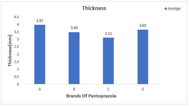 The hardness of tablets determines their resistance to capping, abrasion, or breakage during handling, storage, and transit before use. The load necessary to break or fracture a tablet resting on its edge is known as tablet hardness. This is occasionally referred to as the pillar crushing strength. Five tablets of each brand were ingested, and pressure was applied while the tablet was positioned between the spindles of the hardness tester. Then, the pressure was raised as gradually as possible until the tablet broke, the amount of pressure needed to do so was recorded and read from the device, and the hardness tester's sliding scale was calibrated to zero. I.P. states that the range is 4– 8 kg/cm2.[11]