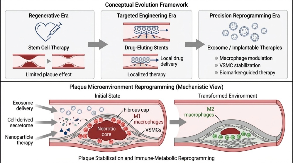 Atherosclerosis therapy is shifting from a limited “regeneration” view to plaque reprogramming, where implanted cells and exosomes are designed as immune?metabolic modulators that tune macrophage polarization, efferocytosis, autophagy, endothelial repair, VSMC phenotypic switching and anti?calcific pathways to shrink necrotic core and thicken fibrous cap, thereby stabilizing plaques and reducing events [26,27,28,29].