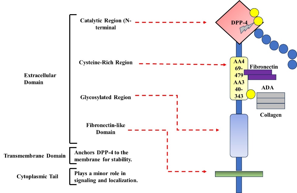 2.2.2. Biological Functions Beyond Glucose Metabolism: DPP-4 is a protein that not only digests other proteins, but also plays a crucial role in important body processes, such as how cells grow, move, and connect with their environment, known as the extracellular matrix [5]. DPP-4 also fulfills its non-proteolytic functions as a receptor or co-stimulatory protein in the field of immunology [10]. DPP-4 also cleaves cytokines and chemokines, contributing to inflammation [11].