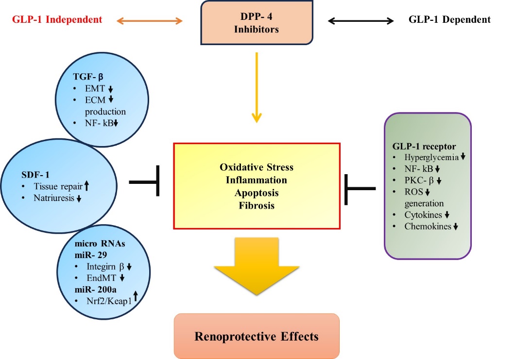 Figure 4. Schematic representation of the kidney-protective actions of DPP-4 inhibitors, including both GLP-1-dependent and independent effects on renoprotection