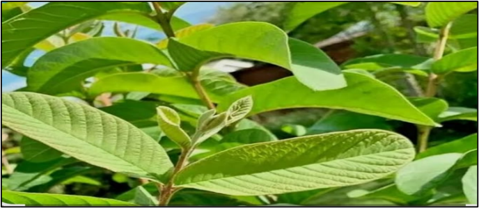 The better understanding morphology guava to better knowledge of plants part like Roots, stem, tree size, leaves, flowers, and fruits. Guava leaves exhibit an oblong to oval shape, measuring and average of 7-15 cm in length and 3-5 cm in width. The leaves have prominent parallel veins that originate from the midrib and extend towards the edges. Arranged oppositely on the stem, which short petioles connecting them, to the emerge from the same point. This deep green leaves have a wide and leathery surface, featuring faint white veins and occasional light brown patches. When crushed, they emit and aromatic scent reminiscent of the guava fruit growing on a small tree with wide spreading branches, the guava leaves compliment the tress coppered colored, flacking bark, revealing green base.[41]