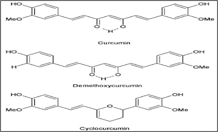 Phytochemical components of turmeric include diaryl heptanoids, a class including numerous curcuminoids, such as curcumin, demethoxycurcumin, and bisdemethoxycurcumin. Some essential oils are present in turmeric, among which turmerone, germacrone, atlantone, and zingiberene are major constituents.[47]