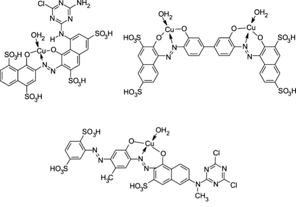 The 1:1 copper complex azo dyes are used both as reactive dyes for cotton and as direct dyes for paper. (For definitions of reactive dyes, which form covalent linkages with the substrate, and direct dyes, which bind more weakly, see refs.23 and 24, respectively.) Typical monoazo dyes are CI Reactive Violet 1 (23) and CI Reactive Blue 13 (25), and the bis-copper-ed dye, CI Direct Blue 80 (26). The navy blue dye, CI Reactive Blue 82 (27), is a typical disazo dye.