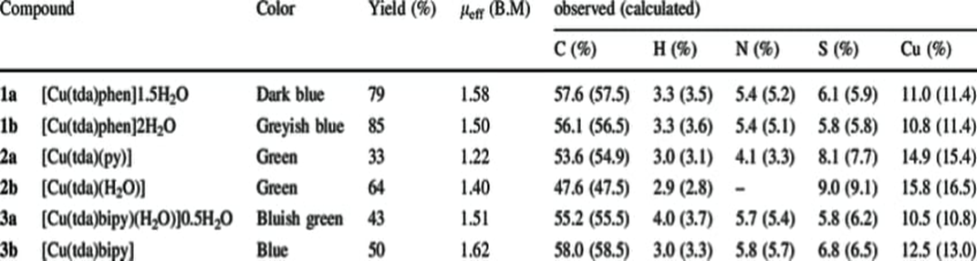 polymers [Cu(tda)(phen)]1.5H2O(1a), [Cu(tda)(py)] (2a) and [Cu(tda)(bipy)(H2O)]0.5H2O(3a) (Fig. 1). However, when the reaction was carried out at high temperature, with phen as co-ligand, the blue powder [Cu(tda)(phen)]?2H2O(1b) was isolated. In the presence of py, a green powder of [Cu(tda)(H2O)] (2b) was obtained, while in the presence ofbipy, a blue powder of [Cu(tda)(phen)] (3b) was isolated. The metal complexes air stable but are insoluble in common organic solvents and water which is consistent with their polymeric nature. The elemental analysis of the complexes is consistent with the proposed composition of the compounds