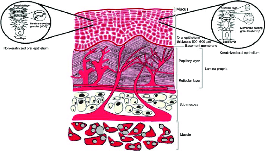 Mucus membranes are the moist surfaces lining walls of various body cavities such as the gastrointestinal and respiratory tracts.Mucus is secreted by the goblet cells. Mucus is present either as a gel layer adherent to the mucosal surface or in suspended form or as a luminal soluble. The major components of all mucus gels are mucin glycoprotein, water, lipids, and inorganic salts. The mucus serves as a protective barrier and for lubrication also.[12]