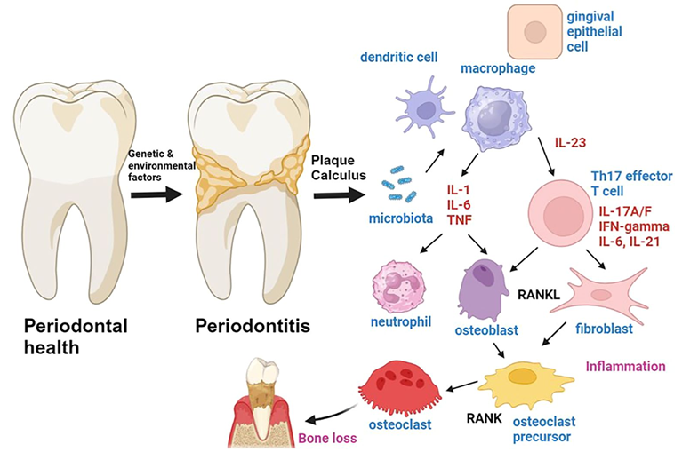 When the body detects these bacteria, it activates immune cells like neutrophils, macrophages, and lymphocytes. These cells release pro-inflammatory chemicals such as interleukin-1β (IL-1β), tumor necrosis factor-alpha (TNF-α), and prostaglandins (Kornman, 2008). While these chemicals are meant to fight infection, they also cause damage to gum tissue. Ongoing inflammation breaks down the periodontal ligament, causes the jawbone to be resorbed, and leads to loss of the tissue that keeps teeth in place—creating deep pockets around the teeth (Page & Kornman, 1997).