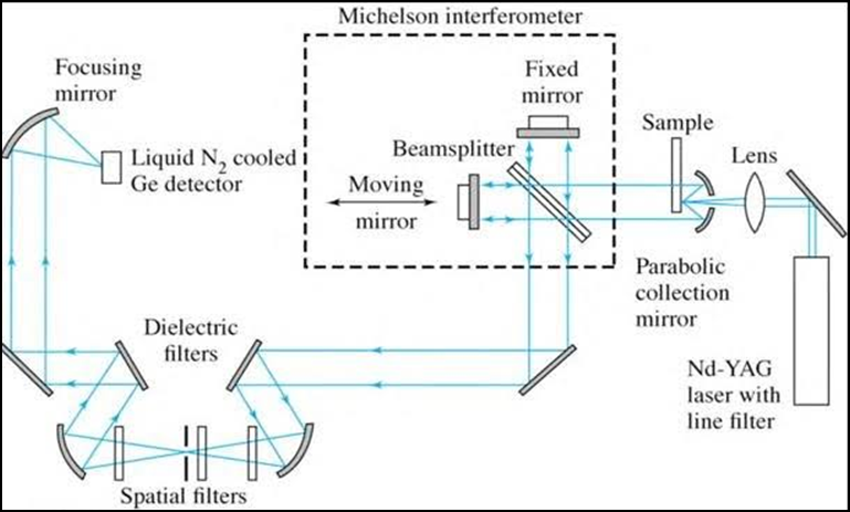 FTIR instrumentation is simple and high accurate, except when synchrotron radiation is used. In FTIR region tungsten filament acts as light source which emits polychromatic radiation. The light is focused into a Michelson Interfometer containing a beam splitter divides the beam into two:
