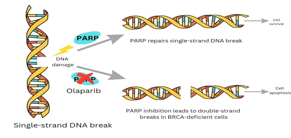Olaparib blocks the ability of cancer cells to repair DNA damage, making it harder for the cells to survive. DNA carries genetic information in both healthy cells and cancer cells. Cells can develop DNA damage spontaneously or from exposure to specific things in the environment (too much sun, for example). Under normal conditions, cells can detect this damage and make repairs. But when DNA is damaged in a healthy cell and the damage isn't fixed, that cell can become cancerous. BRCA1 or BRCA2 gene mutations increase the risk of breast and other cancers because these mutations interfere with cells’ ability to repair damaged DNA. An enzyme called poly ADP-ribose polymerase (PARP) helps repair DNA damage in both healthy and cancer cells. DNA damage will continue to occur in cells that have become cancerous. Olaparib helps kill cancer cells by blocking PARP from fixing DNA damage in those cells.