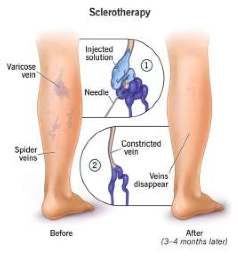 A. Sclerotherapy: By using this therapy, the spider veins or angioectasis are treated. For this treatment some sclerosing agents are used like as sodium salicylate, chromated glycerine they are administered by using small needles.