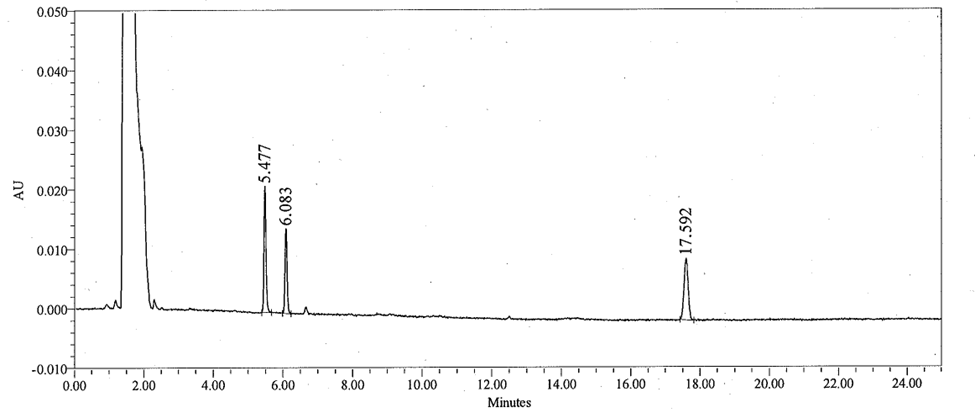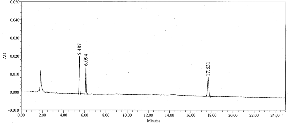 The standard solution at a level of about 1 µg/mL each of Triphenylphosphine oxide, Phenylhydrazine derivative and Triphenylphosphine is injected into the HPLC system for system suitability. The resolution between “Triphenylphosphine oxide and Phenylhydrazine derivative” peaks is a minimum of 2. The column efficiency is determined from the phenylhydrazine derivative peak is not less than 12000 USP plate counts and USP tailing for the same peak is not more than 1.5. Representative chromatogram of standard solution is shown in figure 3.
