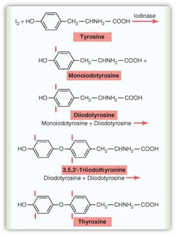 Synthesis of triiodothyronine and tetraiodothyronine is shown below: