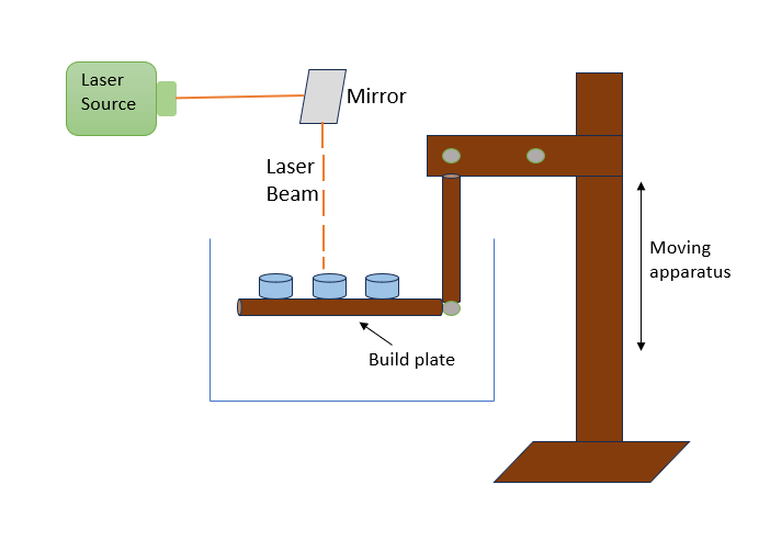 SLA, a vat polymerization technique, was the first technology in the history of 3D printing invented by Charles Hull in 1980 and is widely used in the field of tissue engineering (45). In this process, a photopolymerizable liquid resin is filled in the body of the printer with a build plate which moves along the Z axis inside the resin. It is then exposed to a high-energy source of light, usually in the UV spectrum. When the build plate is lowered, the lasers sweep across it, which will induce polymerization and solidification of the material on the build plate which is present at the top of the resin. The build plate will be further lowered, and the lasers will sweep repeatedly building the 3D object layer by layer according to the defined pattern in the CAD file (25, 46, 47). This process offers several advantages, including exceptional surface finish and resolution, reduced print times, and high versatility, as the active pharmaceutical ingredient (API) can be easily mixed with the photopolymer prior to printing, enabling it to be encapsulated within the solidified matrices. Moreover, localized heating during the printing process is minimized, which is crucial to produce thermolabile drugs. However, it is worth noting that there are some limitations associated with this method. One significant drawback is the limited availability of photocurable resins, restricting the range of materials that can be used. Additionally, the process requires a photo initiator to induce photopolymerization, adding an extra requirement to the printing process (31, 46, 48). Many studies have been conducted demonstrating how SLA technology can be useful in the pharmaceutics industry, like the production of modified release tablets (46), 3D printed implants (49), 3D printed hydrogels (31) and 3D printed microneedle patches (48).