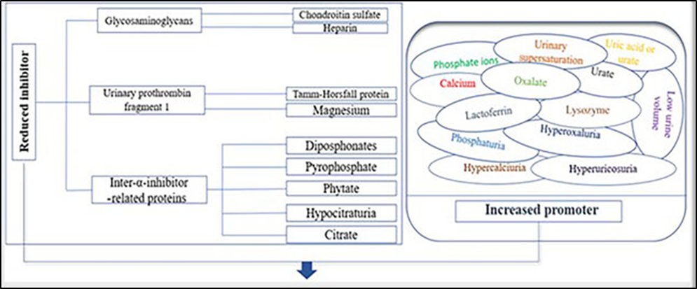 Figure 1. Kidney stone formation's physicochemical processes. Kidney stone formation may be significantly influenced by the increased promoters [right panel] and decreased inhibitors [left panel].
