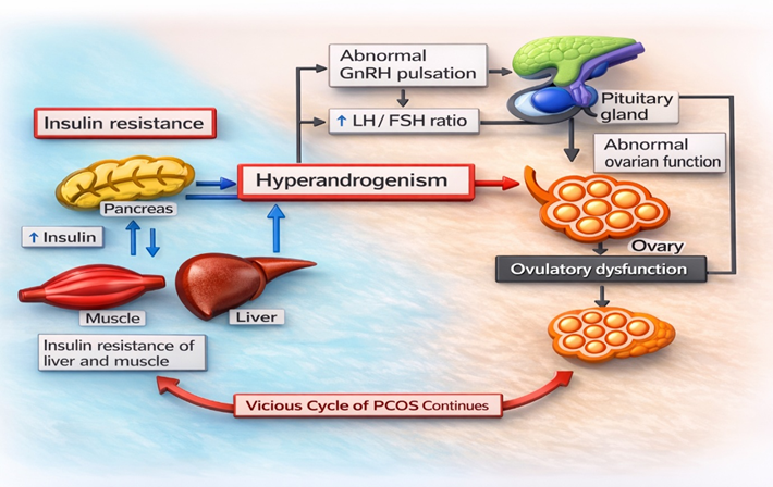 Polycystic ovary syndrome (PCOS) develops mainly because of a disturbance in insulin action and reproductive hormone balance. In many women with PCOS, body tissues such as the liver and muscles do not respond effectively to insulin, so the pancreas produces higher levels of insulin to keep blood sugar normal. This excess insulin directly stimulates the ovaries to produce more androgens (male-type hormones). Elevated androgen levels interfere with the normal development and maturation of ovarian follicles, which prevents regular ovulation. At the same time, hormonal signa-ling from the brain becomes altered, resulting in an imbalance between luteinizing hormone (LH) and follicle-stimulating hormone (FSH), further disturbing ovarian function. Because of these changes, ovulation becomes irregular or may stop completely, menstrual cycles become abnormal, and immature follicles accumulate in the ovaries. These hormonal disturbances also worsen insulin resistance, creating a continuous cycle in which metabolic and hormonal abnormalities reinforce each other. Thus, PCOS is a self-maintaining disorder where insulin resistance and excess androgen production together lead to reproductive and metabolic complications.