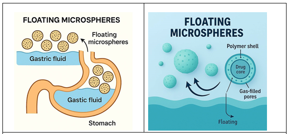 Floating microspheres prepared from Eudragit, ethyl cellulose, Carbopol, BSA, or gelatine not only provide prolonged gastric residence but also enable site-specific, controlled drug release in the GI tract.