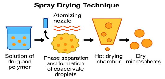 One of the most frequent methods in which a drug solution with a polymer is sprayed into a hot chamber for drying, whereby the solvent is rapidly evaporated, and dry microspheres are formed. Besides this, it allows the production of a large quantity, the control of the particle size (generally 1–100 µm) and the use of materials that are sensitive to heat because of a short time of exposure.