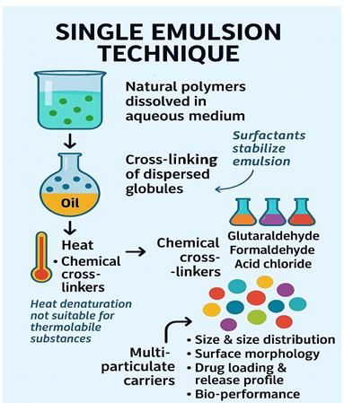 The water-based polymer solutions (for instance, gelatine) are mixed with oil to make a w/o emulsion. After that, the cross-linking is activated by the use of a chemical such as glutaraldehyde. Generally, this technique is utilized in the manufacturing of gelatine-based microspheres and is suitable for hydrophilic drugs.