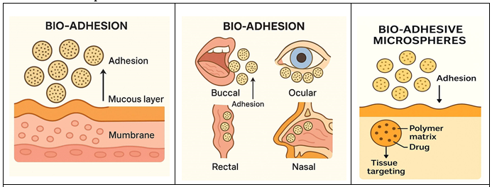 Bio adhesive microspheres are made to stick to mucosal surfaces like the buccal, ocular, nasal, rectal, and vaginal membranes with the help of water-soluble polymers. The sticking of bio adhesive microspheres at the place of absorption increases the time of stay at the site of absorption, hence enhancing drug bioavailability and therapeutic action by intimate and continuous contact with the absorption surface.