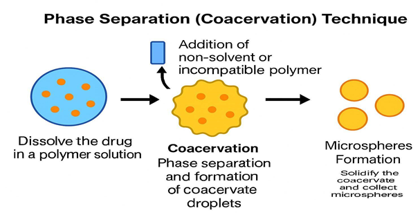 The method exploits the separation of a polymer-rich phase (Coacervation) from a solution by adding a non-solvent or an incompatible polymer. The coacervation phase holds the drug and is attached to the microspheres to be fixed. Hydrophilic, hydrophobic, and lipophilic drugs can be encapsulated by this method, generally resulting in a high drug load.