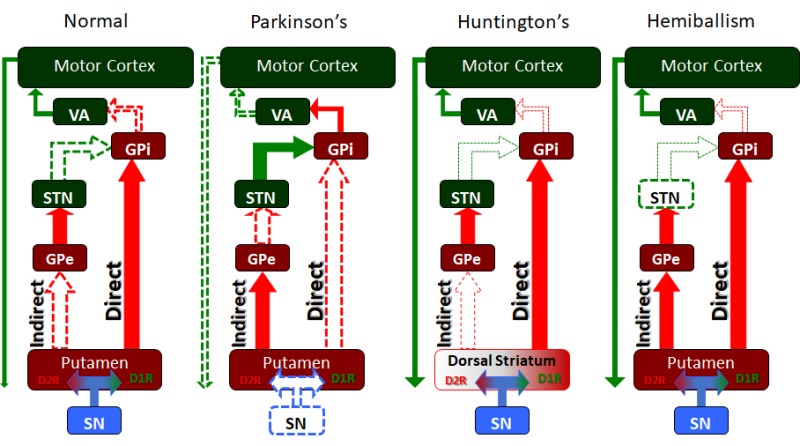 Among its various roles, the basal ganglia are particularly involved in "disinhibiting" or releasing motor action. These sped-up circuit diagrams show how the different basal ganglia nuclei and pathways work together in healthy people and people with a number of extrapyramidal motor diseases, like Huntington's disease, Parkinson's disease, and hemiballismus.