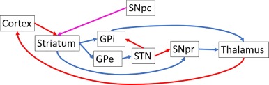 Figure 5. Flowchart of brain regions involved in motion (red = glutamatergic, blue = GABAergic, and magenta = dopaminergic) . (creative commons).