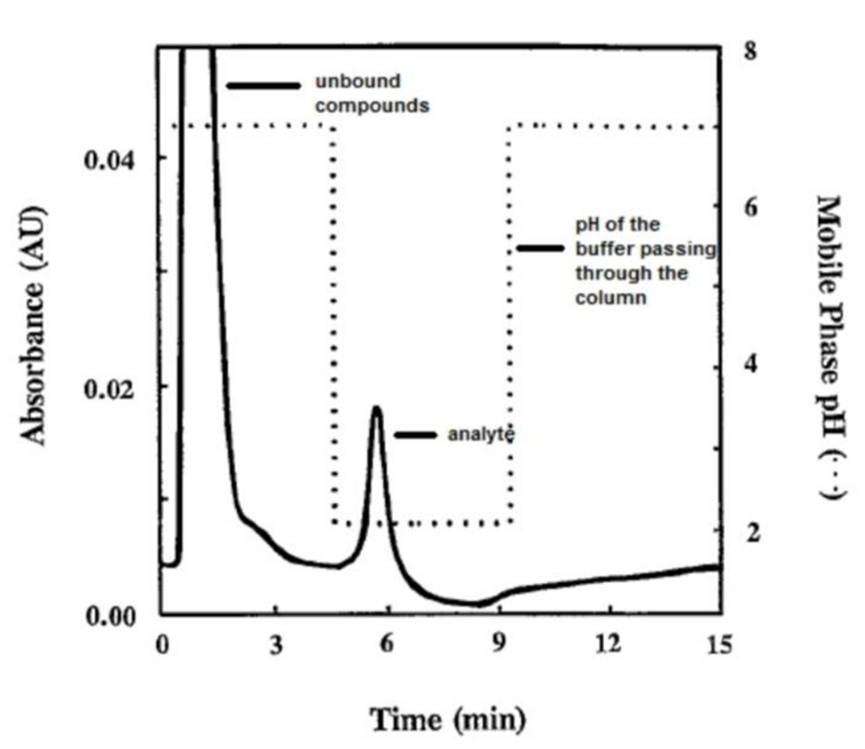The content apart from the analyte passes through the column without or with weak binding to the ligand while the analyte is retarded. Following the analyte is obtained generally by using an elution in order to prepare the buffer, the column is regenerated by washing it with the application buffer. column for the next injection.