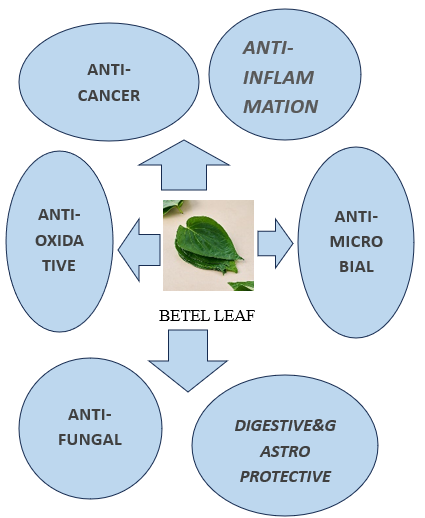 The intricate biological reaction of vascular tissue to pathogens, injured cells, and irritants includes anti-inflammation. Pain, heat, redness, swelling, and loss of function are its hallmarks, and it is a natural defense mechanism. Terpenoids, flavonoids, and phenolic compounds are the primary active ingredients in betel leaf that give it its anti-inflammatory qualities. It has been demonstrated that these substances contain anti-inflammatory and antioxidant properties, which may aid in lowering bodily inflammation. Eugenol, a naturally occurring substance found in betel leaf, has been demonstrated to have analgesic and anti-inflammatory effects. Betel leaf extract has been shown in studies to help lower inflammation in a number of disorders, which might involve skin allergies, asthma, and arthritis.