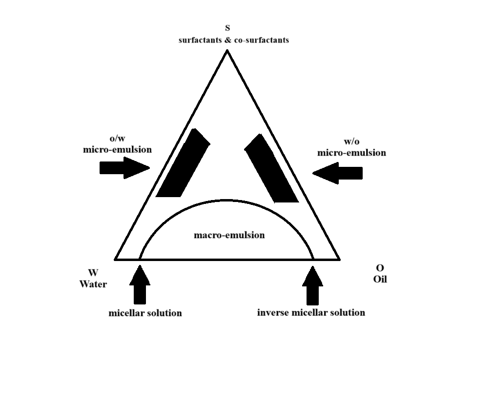 Figure 2.Hypothetical phase regions of microemulsion system of oil (O), water (W), and surfactant + cosurfactant (S) [16]