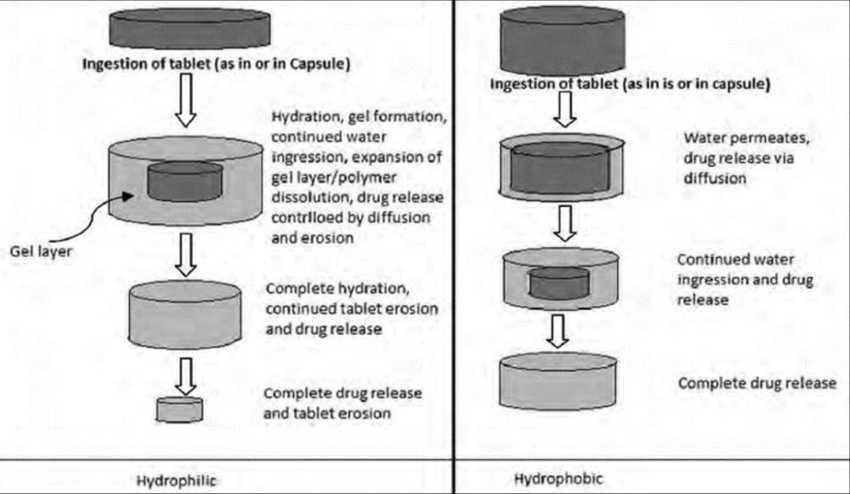 Hydrophilic matrices do not undergo disintegration when delivered to patients, as the drug is entrapped in the polymeric network at the particulate level. Hydrophilic polymers are water soluble or swelling polymers which interact with water and swell then releases drug.3 Hydrophilic polymers are important polymers which are used in different applications like drug delivery, self-assembly, catalysis. Hydrophilic polymers possess important properties not only in dissolved state but also in cross linked state ex: hydrogels. Some polymers are not water soluble but are water swellable. Ex: poly (2-hydroxyethyl methacrylate).