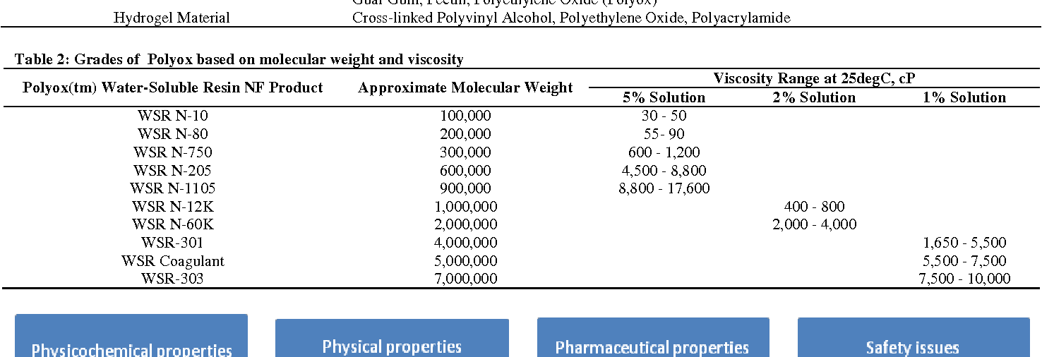Polyethylene oxide is a homopolymer of ethylene oxide, chemically similar to polyethylene glycol. It has molecular weight as high as 100,000 to 7 million. It is commercially available as polyox which is water soluble. 15It posses characteristics like non-ionic, highly hydrophilic, swelling, thermoplastic. It is safe, non toxic, not absorbed throughout GIT.16