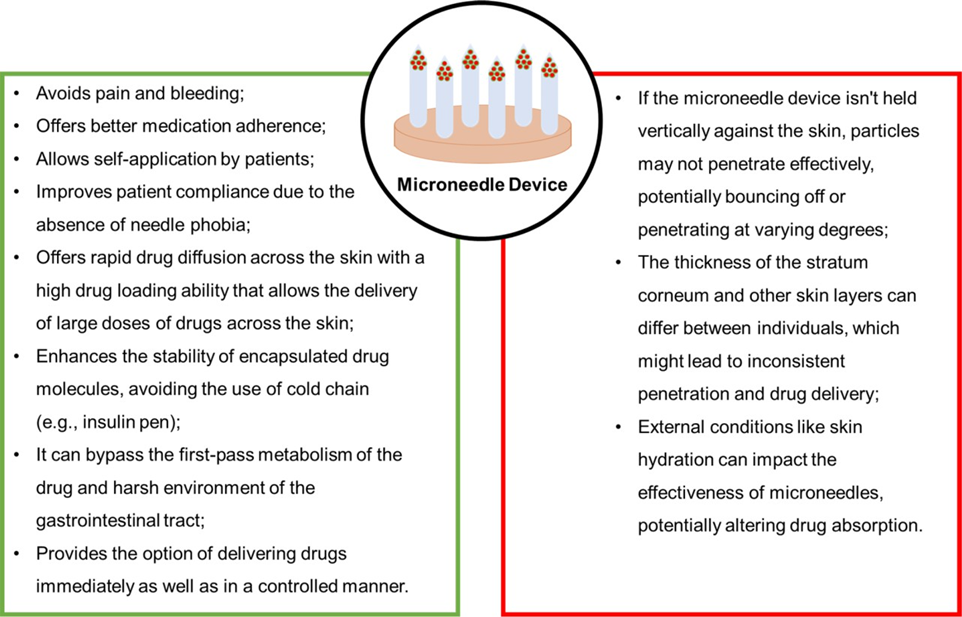 Microneedles (MNs) offer a minimally invasive and effective strategy for drug delivery, particularly for vaccines and other therapeutics. They create microchannels in the skin, allowing drugs to bypass the stratum corneum (the skin's outer layer), which is a major barrier to drug absorption. This approach provides several advantages over traditional methods like injections, including reduced pain, improved patient compliance, and enhanced bioavailability. Pain is a personalized event or body alarm system that can limit a patient's activities and lead to negative repercussions. The commercially available conventional treatment strategies like oral, parenteral, and topical drug delivery systems for pain management are associated with side effects and poor patient compliance. The transdermal route is eminent for its painless distribution. Among transdermal drug delivery system, microneedles (MNs) are gaining attention for their application with delivery at the deeper dermal layer because it bypasses the major barrier of the skin, easily accesses the skin dermal microcirculation, prevents damage to dermal blood vessels, and can be simply inserted into the skin without utilizing any additional applicator devices.