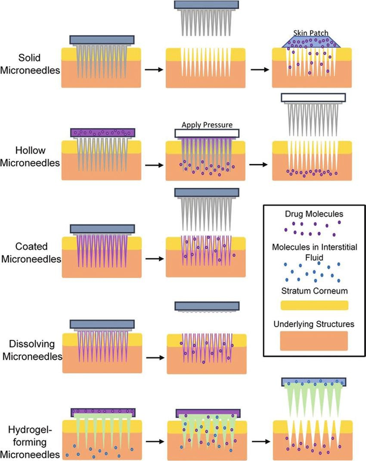 Hydrogel-forming Micro needles: The primary material for the fabrication of hydrogel- forming micro needles (HFMs) is hydrophilic polymer that encloses drugs. This material draws water from interstitial fluid in the stratum corneum and results in polymer swelling and release of drug. Besides, the hydrophilic features of HFMs allow readily uptake of interstitial fluid that could be used for disease diagnosis.