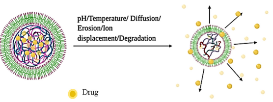 Depending on the characteristics of the polymer used to create them, nanogels can release either tiny molecules or biomolecules. The mesh size of the matrix is crucial for maintaining the release, which can occur through stimuli-mediated release or simple diffusion from the matrix system. Here are some examples of basic release mechanisms: