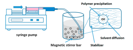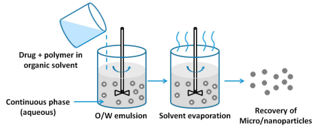 Emulsion evaporation has been utilized for a long time to produce polymeric NPs from as-prepared polymers. The process is based on the emulsification of polymer organic solution into a water phase, followed by organic solvent evaporation. First, the polymer is dissolved in an appropriate solvent (such as methylene chloride, chloroform, or ethyl acetate). To provide the emulsion stability, a surfactant is dissolved in the continuous phase (aqueous phase) after the organic phase has been added. High shear force is used during emulsification in order to minimize the size of the emulsion droplet. The ultimate particle size will be mostly determined by this technique. Following emulsification, the system uses vacuum to evaporate the organic solvent, resulting in the precipitation of polymers and the creation of nanoparticles [67].