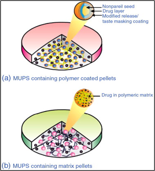 Fig.4: Schematic representation of types of MUPS-(a) MUPS comprising of coated pellets, and (b) MUPS prepared from uncoated/matrix pellets.5,7