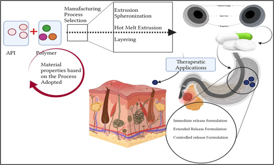 Multiple-Unit Particulate Systems, also known as Multi-Unit Pellet Systems, represent sophisticated drug delivery formulations composed of small, spherical pellets that are enveloped in a polymeric coating. This coating serves to regulate the release profile of the active pharmaceutical ingredient (API), facilitating either modified or sustained release mechanisms shown in Fig:4(a). MUPS are engineered to enhance the bioavailability of drugs with low solubility, improve patient adherence by decreasing the frequency of dosing, and reduce side effects by employing targeted release mechanisms.4