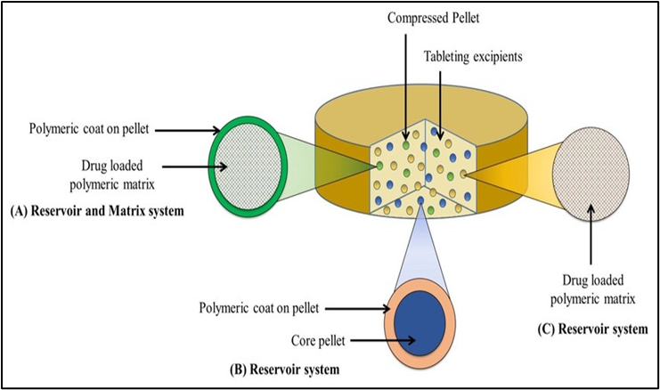 Multiple unit pellet systems have been shown to be better than oral modified release products when it comes to intra- and inter-individual variability of in vivo drug absorption. The primary goal of the prior art is to preserve the altered release characteristics of the individual units, whether those are managed by embedding the active ingredient in a polymeric matrix or by applying a film coat. The pharmaceutical sector has experienced considerable progress in drug delivery mechanisms, with the Multiple Unit Pellet System (MUPS) becoming a leading technology for facilitating controlled and prolonged drug release.3,6 MUPS consist of multiple small pellets contained within a single system, allowing for improved drug release profiles, enhanced bioavailability, and reduced side effects compared to conventional single-unit dosage forms. MUPS are composed of numerous small pellets housed within a unified system, which facilitates better drug release characteristics, increased bioavailability, and minimized side effects in comparison to traditional single-unit dosage forms. These pellets can be filled into hard capsules or be compressed together with suitable fillers and binders into disintegrating pellet containing tablets. Multiple-unit pellet systems (MUPSs) offer several advantages when compared to single-unit dose forms. The enhanced performance regarding both the quantity and rate of absorption of the active ingredient results from decreased variability in stomach residence time, which is effectively reflected in the improved consistency of transit time throughout the entire gastrointestinal tract.3,4,5 The first category of MUPS is prevalent, whereas the second category is encountered less often, despite its clear advantages over the compaction of polymer-coated pellets. Ideally, MUPS should exhibit all the characteristics of a conventional tablet produced through compression.3