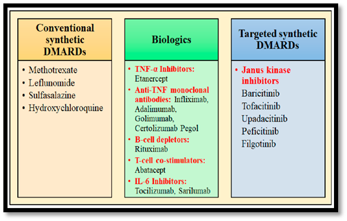 Many medications used to treat rheumatoid arthritis have adverse effects that could be life-threatening. Typically, drugs with the fewest side effects are first prescribed by doctors. As your illness worsens, you might require stronger medications or a mix of medications. Rheumatoid Arthritis (RA) treatment seeks to lessen inflammation, control symptoms, avoid joint damage, and enhance overall quality of life for those who have the condition. The choice of treatment for RA relies on the severity of the condition, the patient's reaction to therapy, and other medical factors. There are various categories of drugs that are used to treat RA.