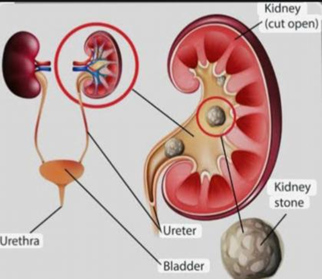Renal stones, calculi of the renal system, or nephrolithiasis are crystalline masses composed of minerals that originate in the renal system. They develop as an outcome of crystallized brought due to a difference in the elements of the stool, including urea, calcium, magnesium, and ammonia. These stones, which block the circulation of urine, vary in shape from tiny grains to larger stones. Common indications include hemorrhage (blood found in the urine), nausea, urgency in the urine, and severe flank discomfort. If neglected, they may result in disease or harm to the kidneys. [4]