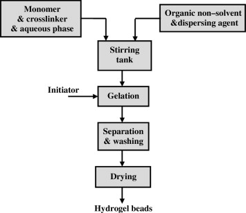 The suspension polymerization method is employed to form spherical hydrogel micro-particles measuring between 1 μm to 1 mm in size. The method of suspension distributes the monomer solution within a non-solvent to form a small droplet stabilized by a stabilizer. The polymerization initiated by the thermal decomposition of the free radical. For removal of unreacted monomers, cross-linking reagent, and initiator, the resulting micro-particle rinsed. 18 Grafting onto a support Grafting is polymerization of a monomer on the backbone of a preformed polymer. Chemical reagents or high-energy radiation therapy activate the polymer chains. On the activated macro radicals, growth of functional monomers results in branching, which subsequently results in crosslinking. 21