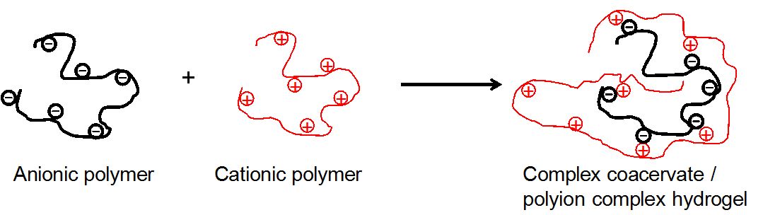Polyanion and polyation can be blended to form complex caoacervate gels. The basic concept in this method is that, based on the concentration and pH of the respective solutions, polymers of opposite charge will bind together and form soluble and insoluble complexes. Coacervation of polyanionic xanthan with polycationic chitosan is one such example. Positive charged proteins below their isoelectric points have a higher tendency to bind with anionic hydrocolloids and form polyion complex hydrogel. 23