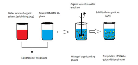 This technique allows for the production of particles with average diameters ranging from 30-100 nm. The key advantage of this method is that it avoids heat generation during the preparation process. In this approach, lipids are generally dissolved in the organic phase within a water bath at 50 °C, and an acidic aqueous phase is utilised to modify the zeta potential, leading to the coacervation of SLN, which can then be easily separated by centrifugation. The SLN suspension is generated swiftly. The entire dispersed system can then be centrifuged and resuspended in distilled water.[13]